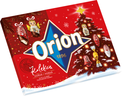 Ozdobte si domov ORION rodinnou kolekcí a udělejte si v předvánočním čase radost mlsáním. V kolekci najdete tyto cukrovinky: duté a plné figurky z mléčné čokolády, figurky plněné mléčnou náplní s lískovými oříšky, šišky KOFILA a salonky s banánovou chutí v hořké čokoládě.