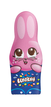 Balenie obsahuje 2x dutú figúrku z mliečnej čokolády s dražovanou mliečnou čokoládou vnútri a plyšovú hračku.