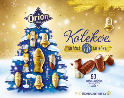 Ozdobte si domov ORION rodinnou kolekcí a udělejte si v předvánočním čase radost mlsáním. V kolekci najdete tyto cukrovinky: duté a plné figurky z mléčné čokolády, figurky plněné mléčnou náplní s lískovými oříšky, šišky KOFILA a salonky s banánovou chutí v hořké čokoládě.