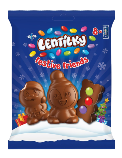 Sáček plný veselých vánočních postaviček z mléčné čokolády s mini dražé LENTIELK a mléčnou náplní určený pro všechny mlsouny, kteří mají rádi LENTILKY, zábavu a rádi se o to podělí.